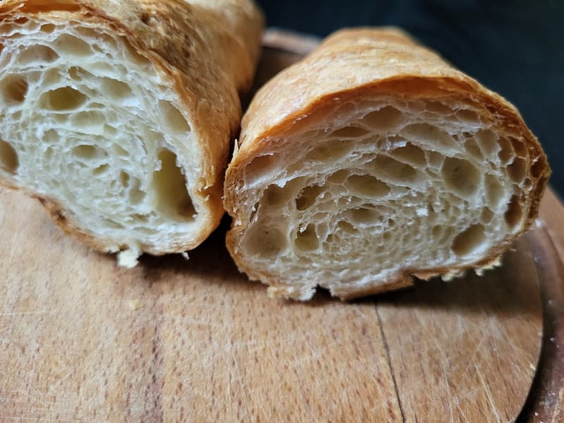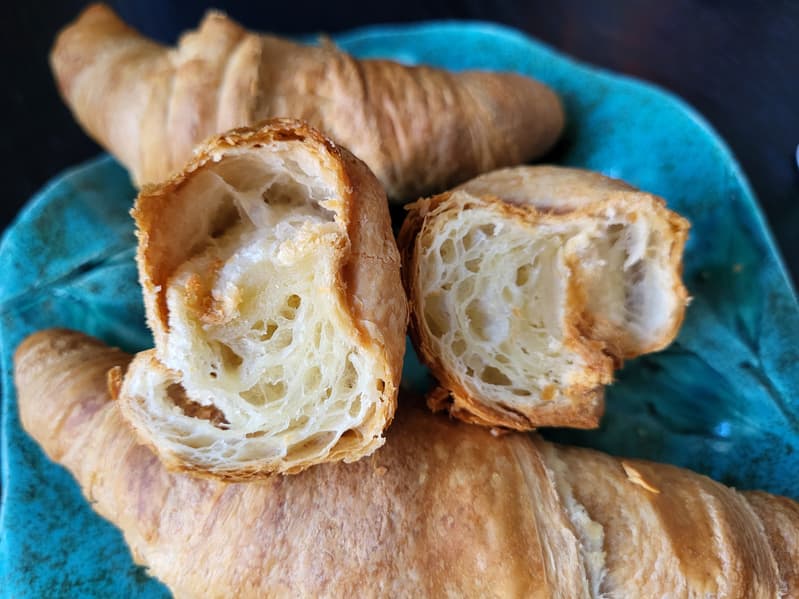 Но внутри тот круассан, который готовился в одиночестве, оказался более пропеченным, чем те, что готовились вместе. На первом фото видна чуть непропеченная сердцевина круассана.