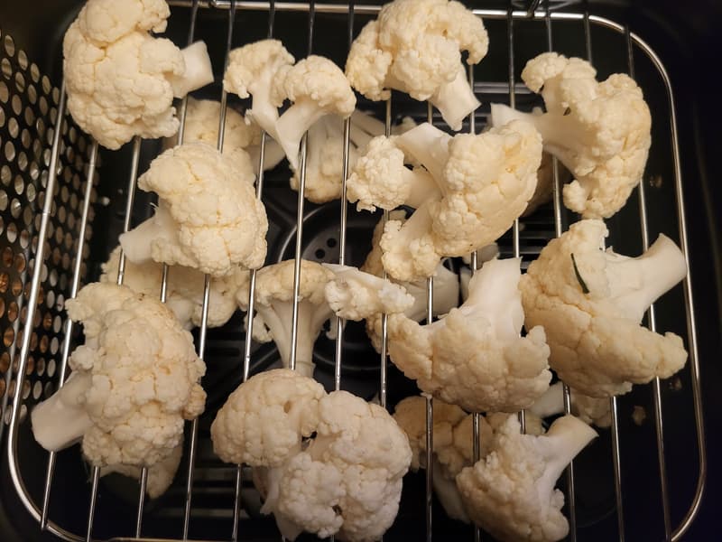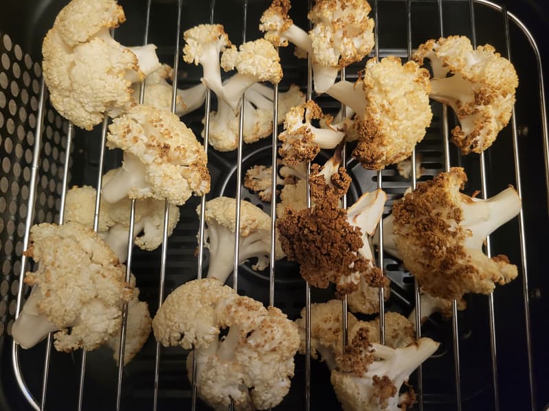За 10 минут капуста дошла до полной готовности, хотя местами, особенно по краям, поджарилась сильнее. Причина понятна: во-первых, соцветия имеют разную форму и толщину, во-вторых, мы снова пропустили момент, когда корзину стоило встряхнуть. Но здесь возникает закономерный вопрос:, а как ее встряхивать, если приготовление идет на двух уровнях одновременно? Да и простое перемешивание тут представляет определенные сложности.