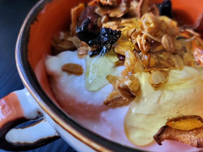 В итоге добавили в йогурт гранолу и мед и съели его с удовольствием, которое компенсировало нам ночные «страдания» от процесса приготовления.