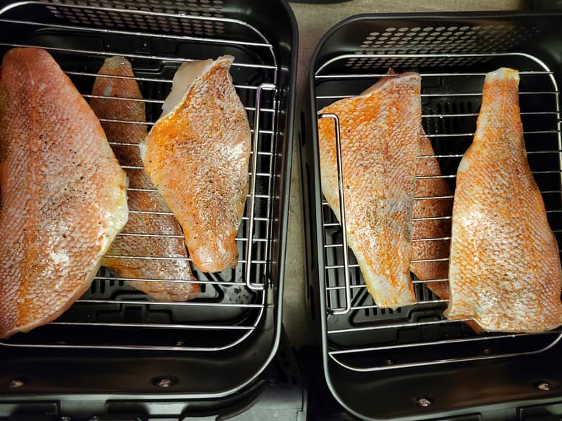 Разложили окуня по решеткам — и основным, и дополнительным — и отправили готовиться, выставив автоматический режим «Рыба», но время поставили не 20 минут, а 10, поскольку окунь нам показался достаточно нежным. Также мы воспользовались функцией Match: выставили параметры только для верхней корзины, и они автоматически продублировались для нижней.