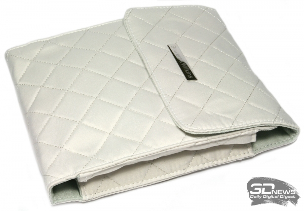 Что касается чехла, то он сшит из двух слоев ткани с мягким наполнителем между ними и простеган. Выглядит он на любителя. Скорее он похож на женскую косметичку, чем на чехол. Зато он удобен, практичен (если не считать его светлого цвета), быстро открывается и закрывается благодаря магнитному замку, а также надёжно сохраняет наушники в дороге. Сами наушники в чехол помещаются в полусложенном виде — с повёрнутыми излучателями. Вместе с наушниками в чехол без проблем войдёт ещё и плеер, для которого внутри предусмотрен кармашек из мягкого материала.