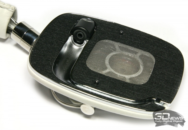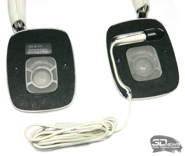 Но используя в легкоразборной конструкции магниты, разработчики преследовали совсем иную цель. Им важно было скрыть в алюминиевом корпусе разъём для подключения аудиокабеля. Металлический корпус чашек имеет фигурную фрезерованную канавку для его укладки. При этом каждый канал подключается строго к своему разъёму. Перепутать их можно, но на штекерах есть соответствующие обозначения, препятствующие этому. Как и у модели Bowers&Wilkins P3, разъём можно отклонить на небольшой угол для удобства подключения. Ну, а расположенный в центральной части излучатель закрыт от случайного повреждения синтетической сеточкой.