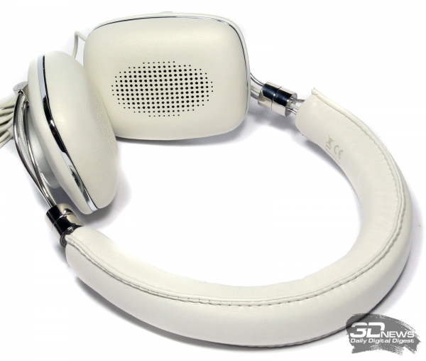 Оголовье и держатели чашек полностью выполнены из металла. Верхняя часть закрыта мягким пеноматериалом, обтянутым грубо сшитой кожей. Грубые стежки в данном случае — это не брак производителя, а элемент декора. Держатели чашек выполнены точно так же, как и у модели Bowers&Wilkins P3: те же крупные металлические узлы с поворотным механизмом, та же плавная и в меру тугая регулировка длины дужек. Из-за отсутствия дискретного хода и маркировки по длине, наушники нельзя отрегулировать за секунду, зато можно подстроить максимально точно. Возможности сложить Bowers&Wilkins P5 не предусмотрено, но для размещения наушников в чехле чашки можно развернуть на 90 градусов и таким образом уменьшить один из габаритов.