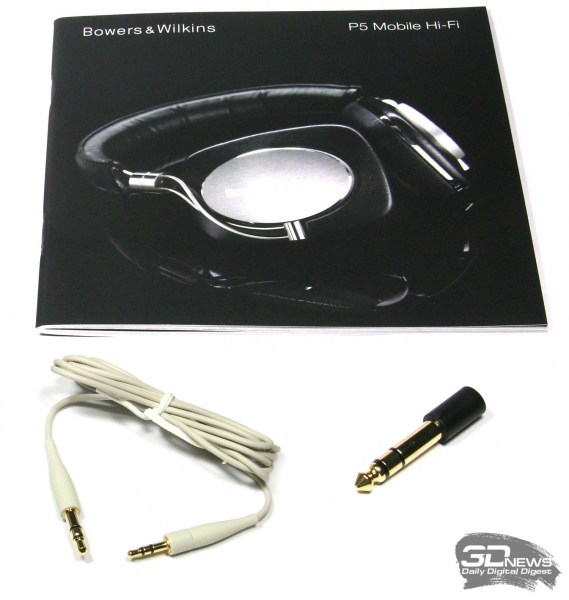 Помимо наушников, в коробке мы нашли дополнительный аудиокабель, переходник с 3,5-мм штекера на 6,3-мм разъём, чехол для хранения и транспортировки наушников и небольшой рекламный проспект. Как и в случае с моделью Bowers&Wilkins P3, дополнительный кабель отличается отсутствием пульта ДУ для управления мобильными устройствами компании Apple.