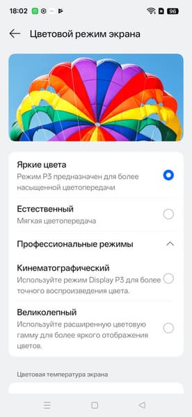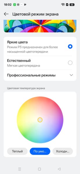 Эти профили различаются цветовым балансом (без дополнительной коррекции при выборе профилей Естественный и Кинематографический цвета теплее, а при выборе профилей Яркие цвета и Великолепный — холоднее) и цветовым охватом (от sRGB до шире Display P3/DCI-P3). Во всех профилях есть возможность скорректировать цветовой баланс с помощью выбора профиля цветовой температуры или регулировки оттенка на цветовом круге.