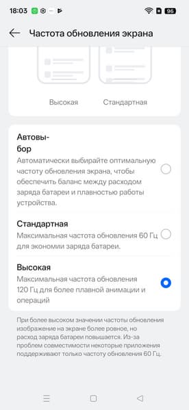 По факту режим всегда динамичный и, если не касаться экрана, то частота обновления может снижаться до 60 Гц (по данным мониторинга). Данной настройкой пользователь ограничивает только максимальную частоту обновления.