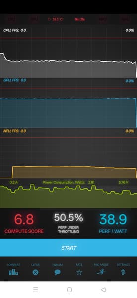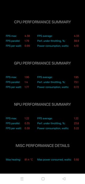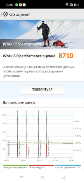Тест на снижение производительности при нагреве мы проводим с помощью программы Burnout Benchmark, которая позволяет нагружать CPU, GPU и NPU. Уровень тротлинга GPU низкий (но и уровень производительности ему под стать).