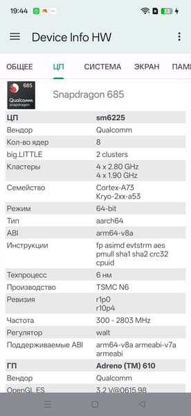 - SoC Qualcomm SM6225 Snapdragon 685, 8 процессорных ядер (4×Cortex-A73 @2,8 ГГц + 4×Cortex-A53 @1,9 ГГц)