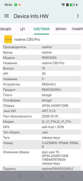 В качестве программной платформы в Realme C85 Pro используется собственный интерфейс Realme UI 6.0 на основе Android 15. Это неплохо оптимизированный интерфейс с лаконичной организацией. Верхняя шторка разделена на две части в зависимости от места оттягивания. Есть полный доступ к сервисам Google. К сожалению, Realme теперь не гнушается использовать всплывающую рекламу в своих недорогих смартфонах (в отличие от дорогих). К тому же, наблюдаются притормаживания интерфейса из-за очень слабого процессора.