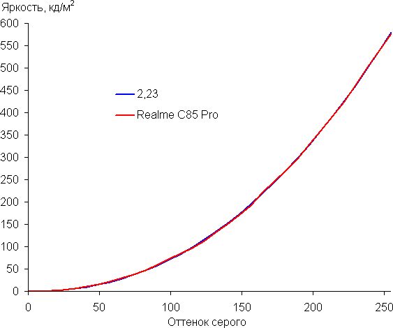 Построенная по 33 точкам с равным интервалом по численному значению оттенка серого гамма-кривая показала, что существенного завала нет ни в светах, ни в тенях. Показатель аппроксимирующей степенной функции равен 2,23, что близко к стандартному значению 2,2. При этом реальная гамма-кривая мало отклоняется от степенной зависимости: