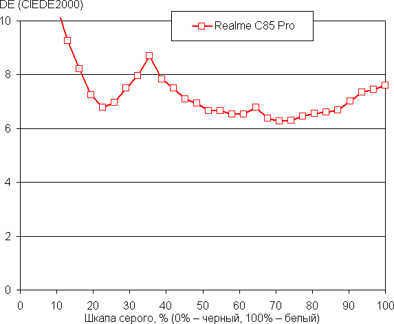 (Самые темные области шкалы серого в большинстве случаев можно не учитывать, так как там баланс цветов не имеет большого значения, да и погрешность измерений цветовых характеристик на низкой яркости высокая.)