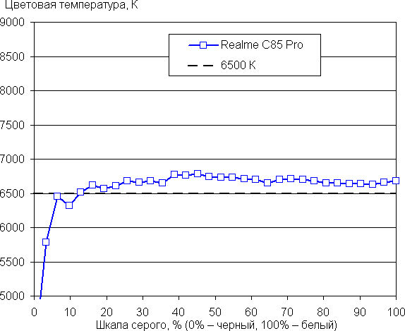 Баланс оттенков на шкале серого после выбора профиля Естественный или Кинематографический хороший — цветовая температура достаточно близка к стандартным 6500 К и отклонение от спектра абсолютно черного тела (ΔE) ниже 10 единиц, что для потребительского устройства считается приемлемым показателем. При этом цветовая температура и ΔE мало изменяются от оттенка к оттенку — это положительно сказывается на визуальной оценке цветового баланса: