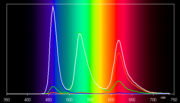 Во втором случае компоненты цветов подмешиваются друг к другу в значительной степени, что и приводит к сужению цветового охвата: