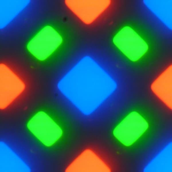 В этом экране используется матрица Super AMOLED — активная матрица на органических светодиодах. Полноцветное изображение создается с помощью субпикселей трех цветов — красного ®, зеленого (G) и синего (B), но красных и синих субпикселей в два раза меньше, что можно обозначить как RGBG. Это подтверждается фрагментом микрофотографии: