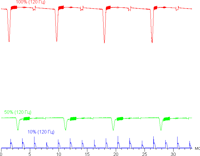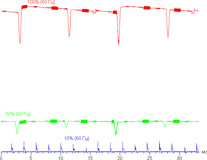 Видно, что на высокой и средней яркости скважность модуляции низкая, в итоге видимого мерцания нет. Однако при сильном понижении яркости появляется модуляция с частотой 480 Гц с большой относительной амплитудой и высокой скважностью, ее наличие уже можно увидеть в тесте на присутствие стробоскопического эффекта или просто при быстром движении глаз. В зависимости от индивидуальной чувствительности такое мерцание может вызывать повышенную утомляемость. Впрочем, фаза модуляции различается по площади экрана, а частота довольно высокая, поэтому негативный эффект от мерцания снижен.
