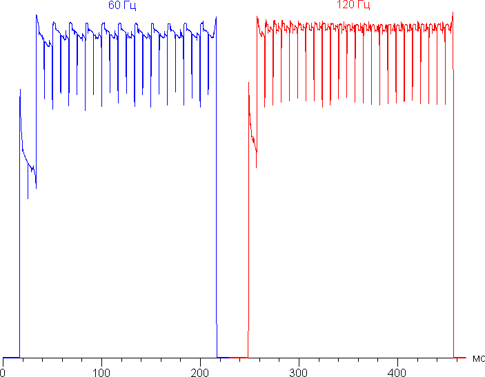 Переключение состояния элементов матрицы выполняется практически мгновенно, но на фронте включения может присутствовать ступенька, ширина которой зависит от текущей частоты обновления. Для частоты обновления в 60 Гц это примерно 17 мс, для 120 Гц — примерно 8 мс. Например, так выглядит зависимость яркости (вертикальная ось) от времени (горизонтальная ось) при переходе от черного к белому и обратно (режим 60 Гц и 120 Гц):