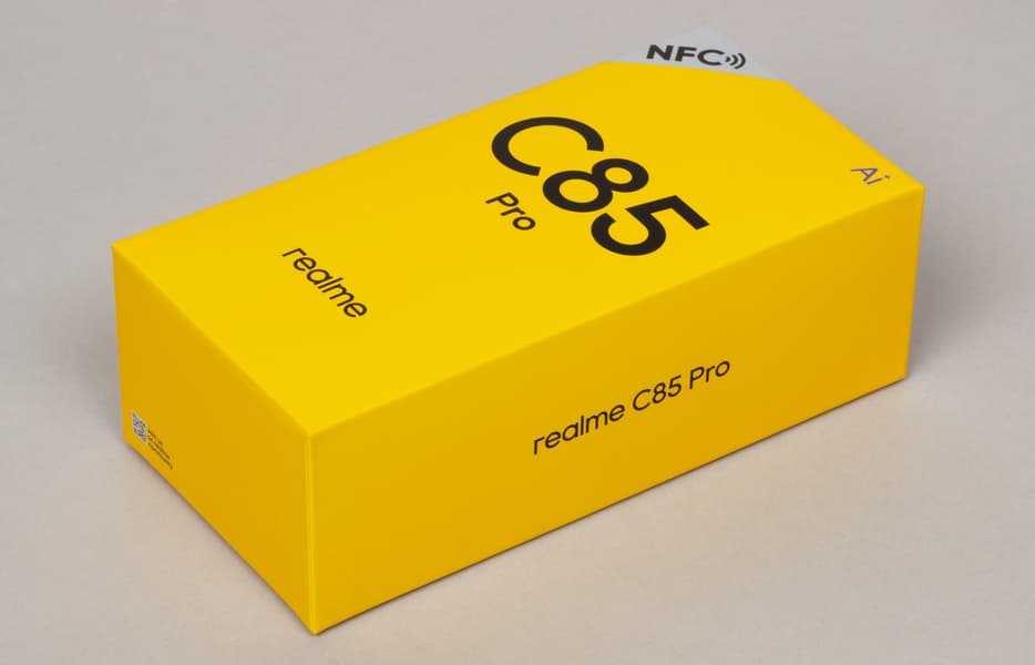 Realme C85 Pro поставляется в картонной упаковке с оформлением в фирменных цветах.