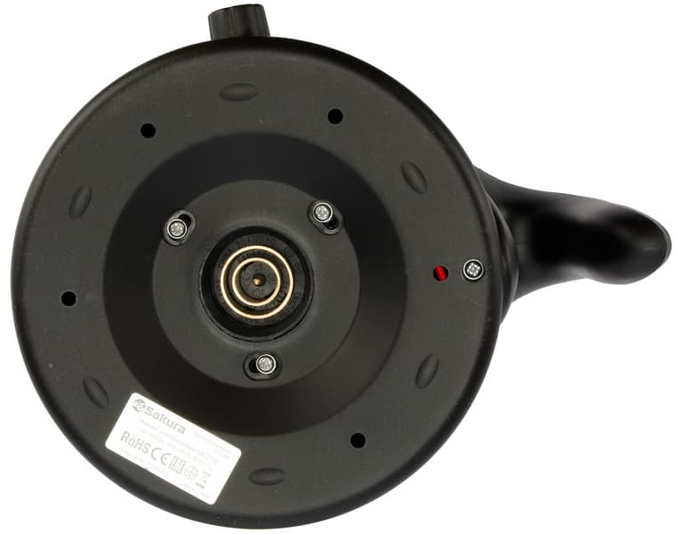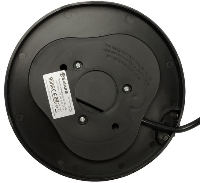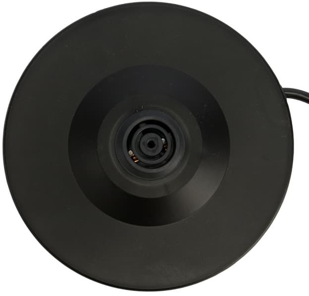 Снизу мы найдем контактную группу, состоящую из двух концентрических колец и центрального штырька, а также еще одну наклейку с технической информацией. Чайник, таким образом, как и положено чайнику, способен вращаться на базе на 360 градусов.