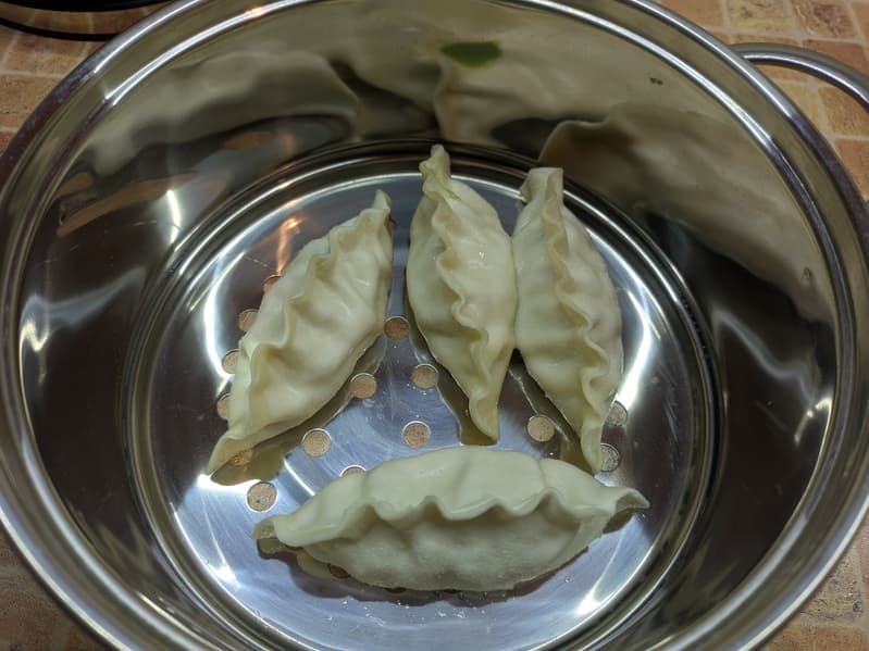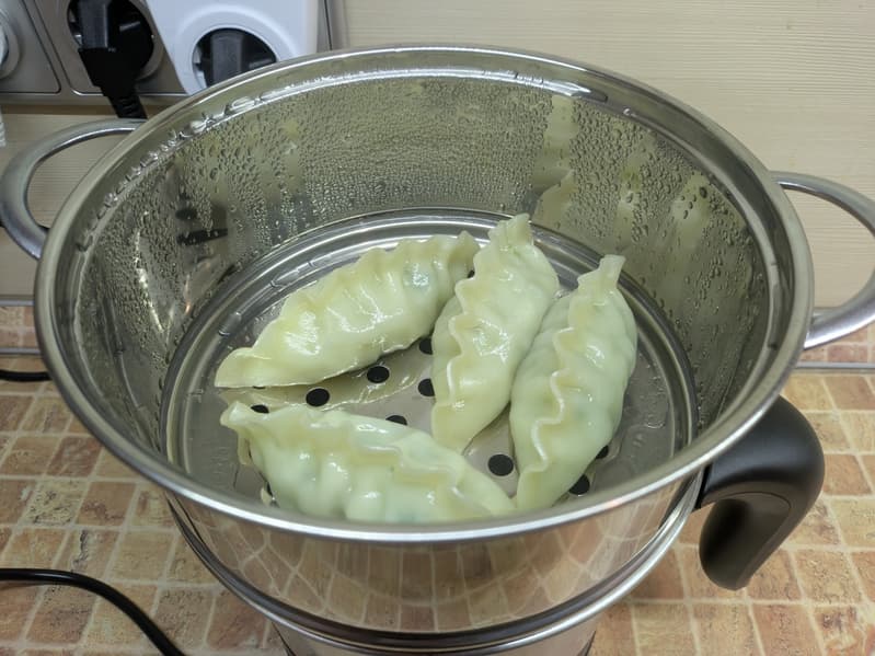 Следующий тест — паровые японские пельмени гедза. Их положено готовить около 7 минут. Собственно, в том, что гедза приготовятся как надо, мы уже не сомневались. Скорее нас интересовало, насколько комфортным будет сам процесс.
