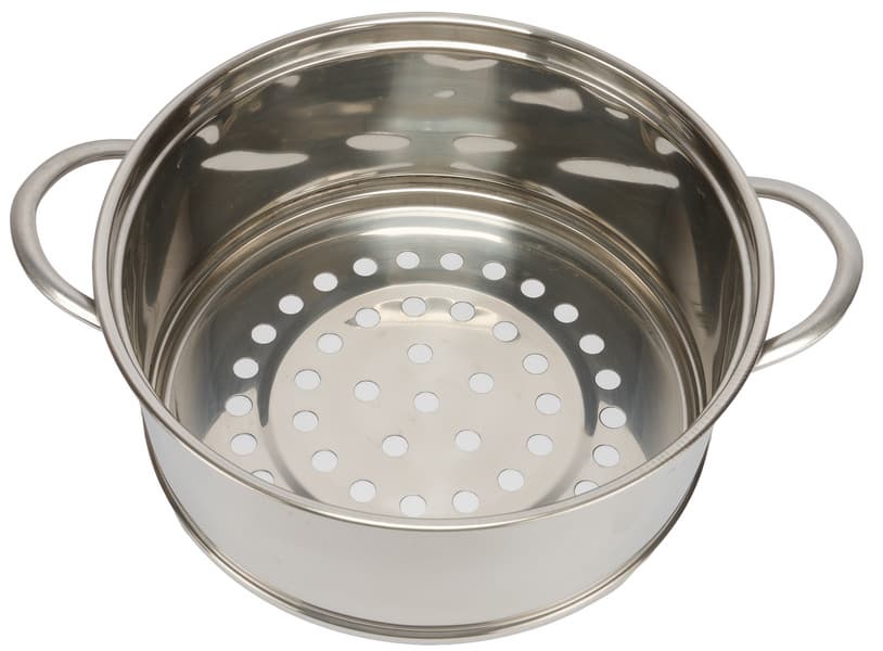 Металлическая насадка-пароварка со множеством отверстий на дне и металлическими ручками имеет диаметр 17,5 см и глубину 7 см. Она, очевидно, предназначена для приготовления всевозможных блюд на пару́. Габариты пароварки не очень большие, так что приготовить, например, большую порцию пельменей вряд ли получится.