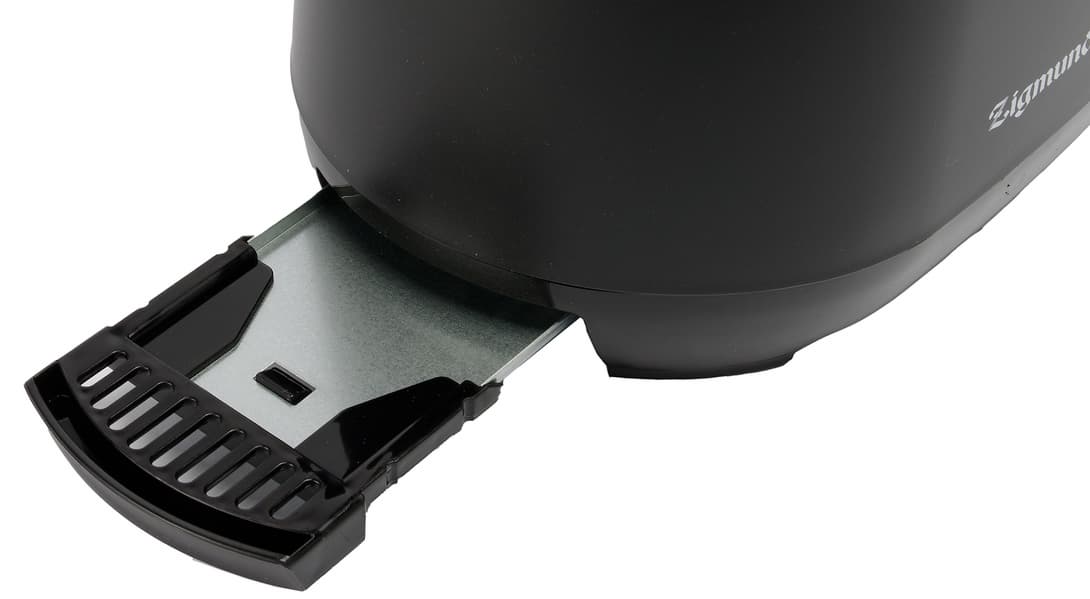 В нижней части прибора находится поддон для сбора крошек, который выдвигается и задвигается с небольшим усилием. Поддон можно без труда вынуть из тостера, вытряхнуть и вставить обратно. На своем месте поддон защелкивается, так что случайно он не выпадет.