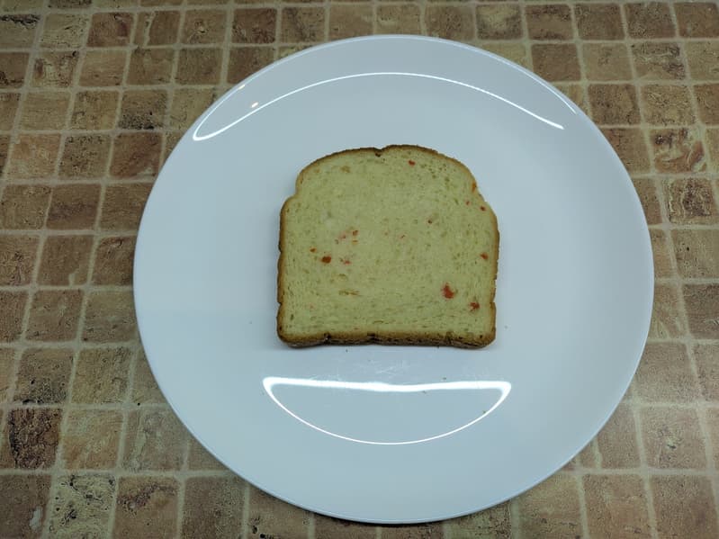 Но сначала мы сфотографировали кусочек непрожаренного тоста. Небольшие оранжевые вкрапления — это кусочки кукурузы, так что не надо пугаться, всё в порядке.