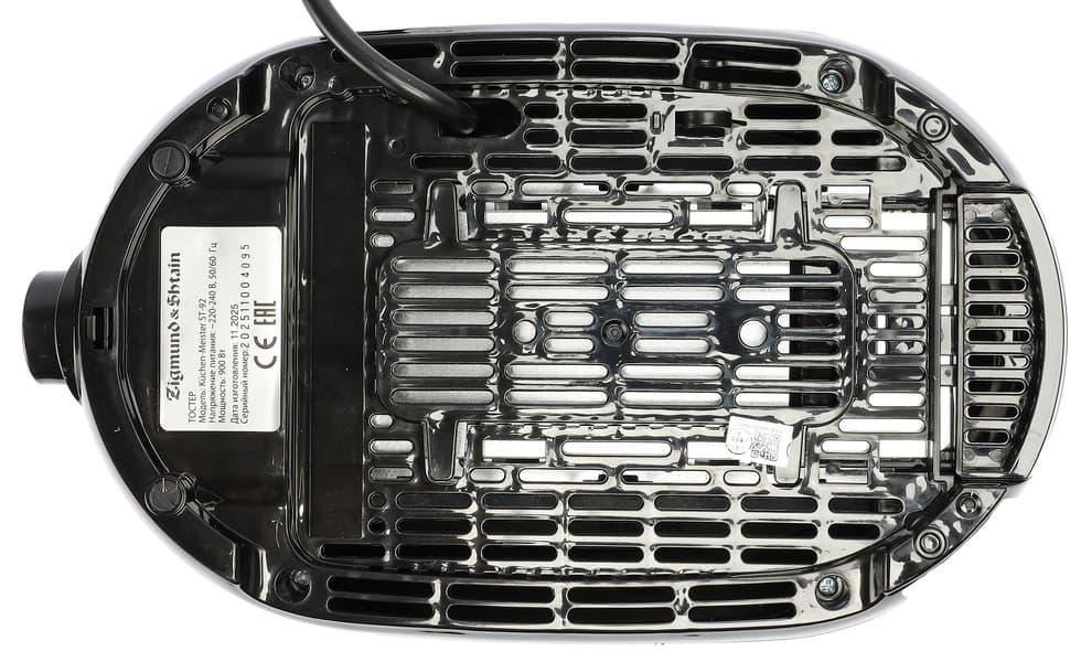 Нижняя часть тостера изготовлена из черного глянцевого пластика, в котором предусмотрены вентиляционные щели для циркуляции нагретого воздуха, есть выход электрического шнура и четыре ножки с прорезиненными накладками, с помощью которых прибор фиксируется на поверхности. Излишки шнура можно намотать на специальные «ушки». Также на нижней части корпуса имеется наклейка с технической информацией о приборе и его изготовителе.