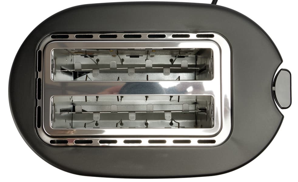 Заглянув в прибор сверху, мы увидели стандартную картину. Тут расположены два прямоугольных отсека для тостов. По идее, согласно указаниям на коробке, тут должен располагаться механизм центрирования, назначение которого — выравнивать тосты по отношению к нагревательным элементам и обеспечивать равномерную прожарку с двух сторон.