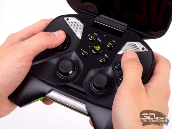 А геймпад в SHIELD не только крупный, но и очень удобный. В качестве образца расположения органов управления разработчики также использовали контроллер Xbox 360, с тем лишь отличием, что два аналоговых стика находятся вместе, а крестовина — сбоку, как на PlayStation. Кроме того, поскольку у SHIELD есть крышка, все кнопки погружены в плоскость корпуса, но неудобств это не вызывает. По тактильным качествам кнопки и аналоговые стики также очень хороши.