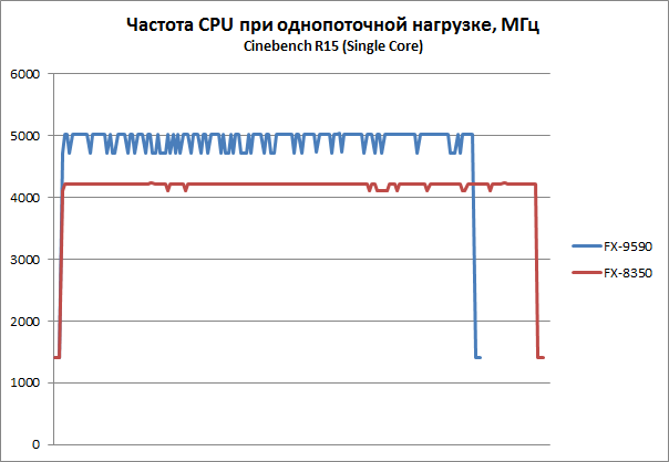 Проиллюстрировать то, как работает Turbo Core в FX-9590, можно, наблюдая за его частотой при невысокой нагрузке. Например, на приведённом ниже графике мы сопоставили мгновенные частоты FX-9590 и FX-8350 при выполнении однопоточного теста Cinebench R15.