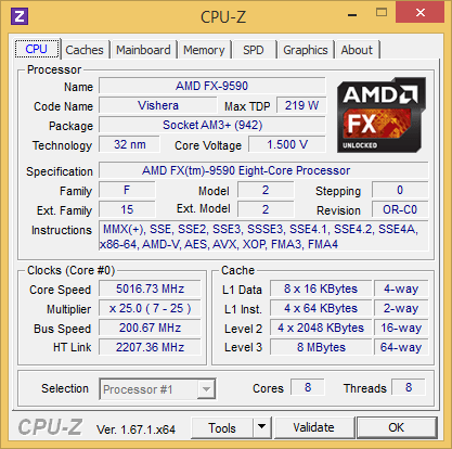 Номинальные частоты FX-9590 близки к тому пределу, до которого разгоняются прочие восьмиядерники Vishera в обычных условиях, без применения экстремальных методов охлаждения. Да и сам этот процессор фактически представляет собой узаконенный разгон FX-8350: на это недвусмысленно указывает повышенное напряжение питания и увеличенное расчётное тепловыделение. Поэтому ожидать от FX-9590 работоспособности на частотах, значительно превышающих стандартные, не приходится. До сих пор типичным разгоном в обычных условиях для восьмиядерных Vishera считалась частота в окрестности 4,7 ГГц, но для FX-9590 она стала штатной. Конечно, некоторому росту частотного потенциала нового флагмана мог посодействовать отбор наиболее удачных полупроводниковых кристаллов и произошедшее за последний год совершенствование 32-нм производственной технологии, однако, как правило, это может дать заметный эффект лишь при установлении оверклокерских рекордов, но не при каждодневном использовании.
