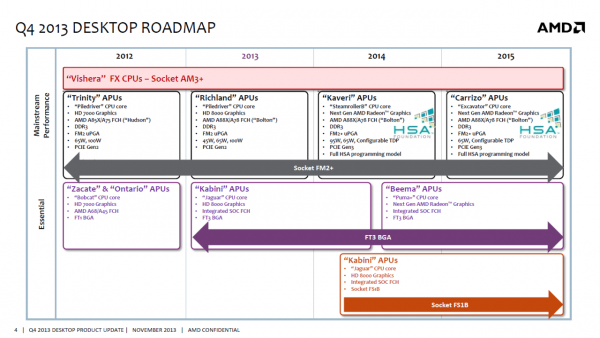 Надо заметить, что, несмотря на столь скептичное отношение AMD к собственным высокопроизводительным решениям, направление гибридных процессоров будет достаточно активно прогрессировать. Перспективные микроархитектуры Steamroller и Excavator, которые, согласно планам компании, обойдут стороной старшие процессоры AMD, появятся в намеченных к выпуску в 2014 и 2015 годах соответственно процессорах Kaveri и Carrizo для платформы Socket FM2+. Однако они получат в своё распоряжение не более четырёх вычислительных ядер и будут позиционироваться в качестве средних или даже бюджетных решений, а не как производительные CPU. Развитие же продуктов верхнего уровня, предлагающих по восемь вычислительных ядер, похоже, зашло в тупик. Внедрение новых микроархитектур в них не планируется, а старая микроархитектура Piledriver, использующаяся в современных процессорах Vishera для платформы Socket AM3+, увеличить быстродействие экстенсивными методами уже не позволяет.
