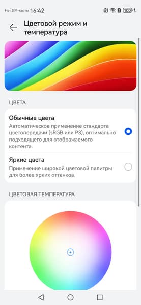 Обычные + профиль Display P3Отметим, что на экранах с уширенным цветовым охватом (без соответствующей коррекции) цвета́ обычных изображений, оптимизированных для устройств sRGB, выглядят неестественно насыщенными. Отсюда и рекомендация: в большинстве случаев смотреть кино, фотографии и все естественное лучше при выборе профиля Обычные цвета. При этом, если в изображении прописан отличный от sRGB профиль, то смотреть его лучше с использованием штатной программы Галерея.