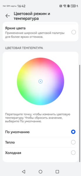 В этом устройстве есть возможность скорректировать цветовой баланс с помощью выбора профиля цветовой температуры или регулировки оттенка на цветовом круге.
