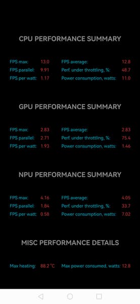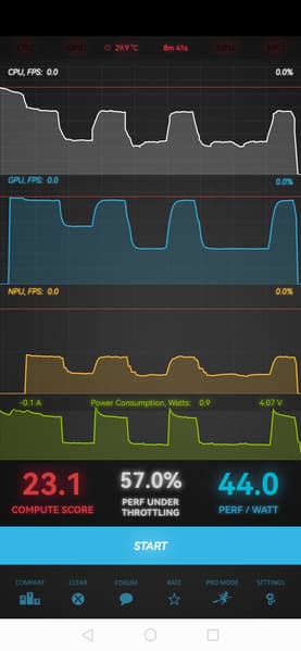 Тест на снижение производительности при нагреве мы проводим с помощью программы Burnout Benchmark, которая позволяет нагружать CPU, GPU и NPU. Уровень тротлинга GPU в целом средний; видно, как он меняется скачками в рамках борьбы с перегревом.