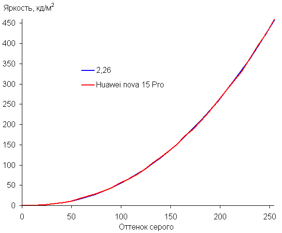 Построенная по 33 точкам с равным интервалом по численному значению оттенка серого гамма-кривая показала, что существенного завала нет ни в светах, ни в тенях. Показатель аппроксимирующей степенной функции равен 2,26, что немного выше стандартного значения 2,2, при этом реальная гамма-кривая мало отклоняется от степенной зависимости: