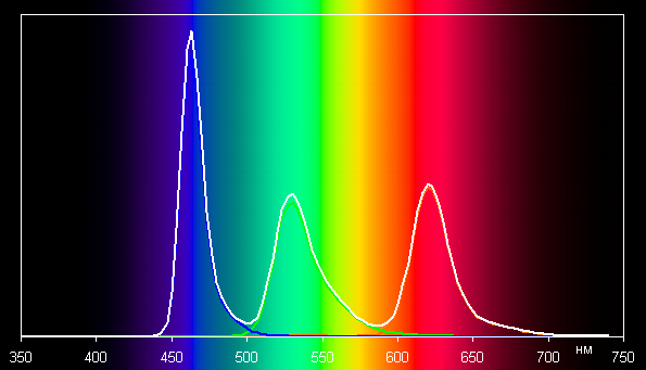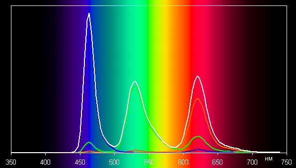 Обычные цвета + профиль sRGBВ первом случае спектры компонент (то есть спектры чистых красного, зеленого и синего цветов) очень хорошо разделены: