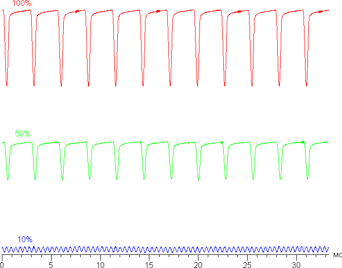На любом уровне яркости присутствует значимая модуляция с частотой 360 Гц. На рисунках ниже приведены зависимости яркости (вертикальная ось) от времени (горизонтальная ось) для нескольких значений настройки яркости: