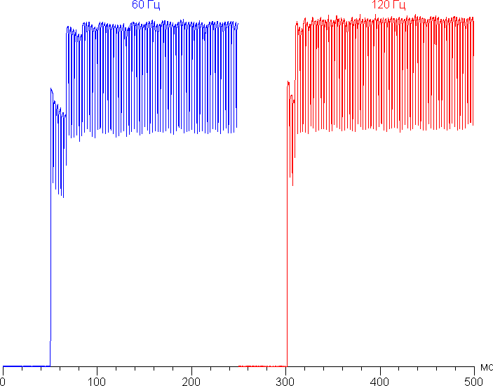 Переключение состояния элементов матрицы выполняется практически мгновенно, но на фронте включения может присутствовать ступенька, ширина которой зависит от текущей частоты обновления. Для частоты обновления в 60 Гц это примерно 17 мс, для 120 Гц — примерно 8 мс. Например, так выглядит зависимость яркости (вертикальная ось) от времени (горизонтальная ось) при переходе от черного к белому (режим 60 Гц и 120 Гц):