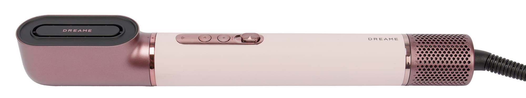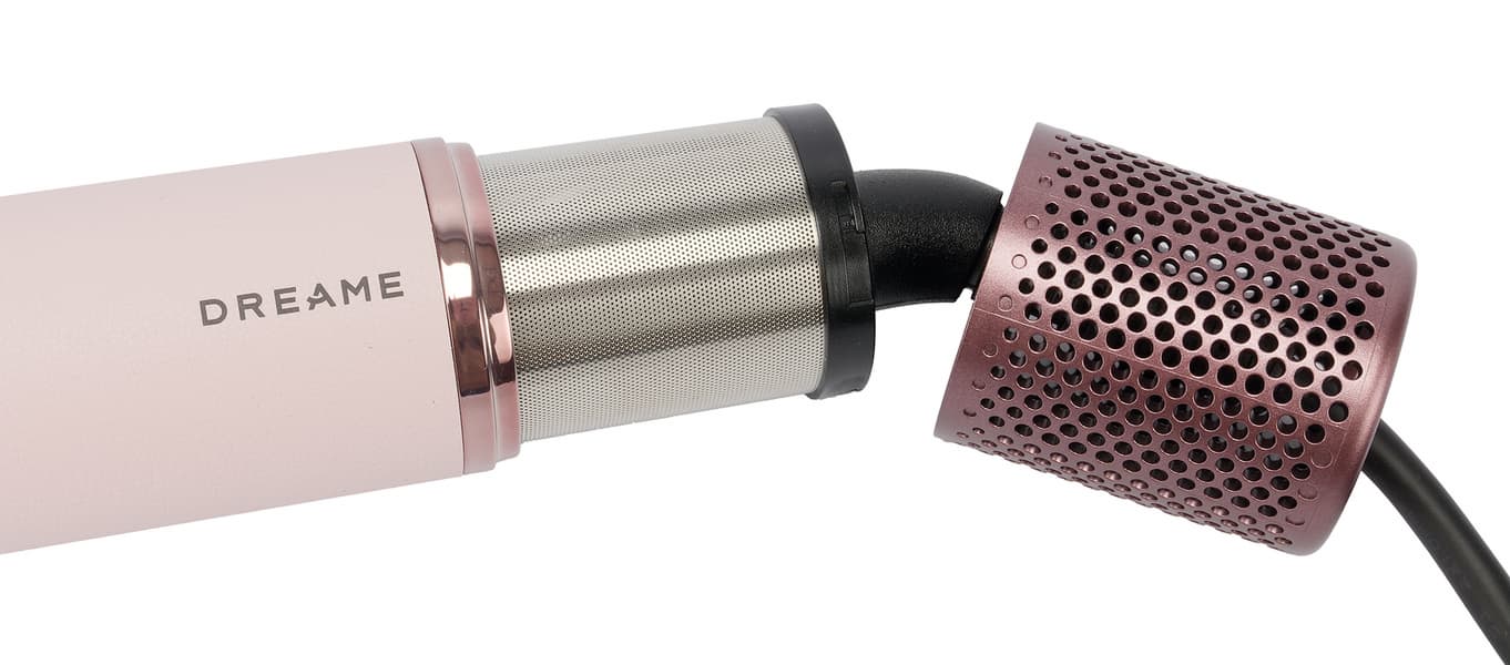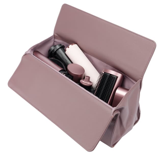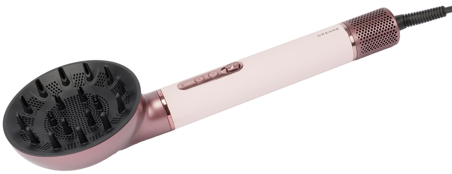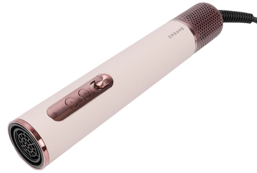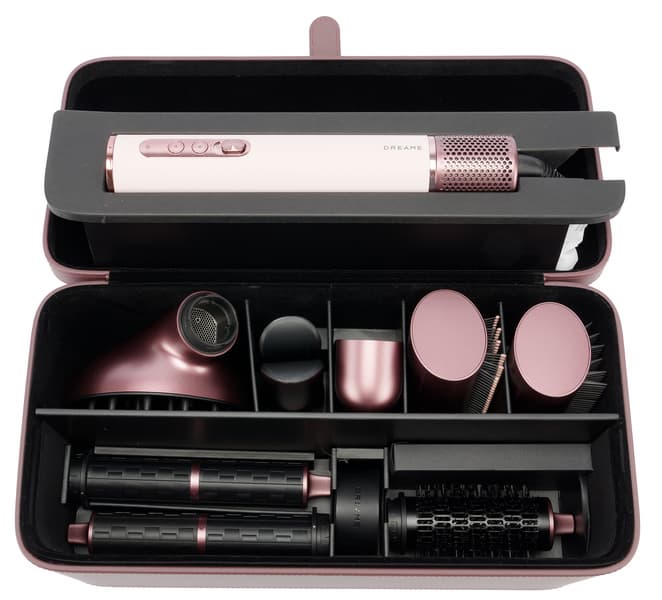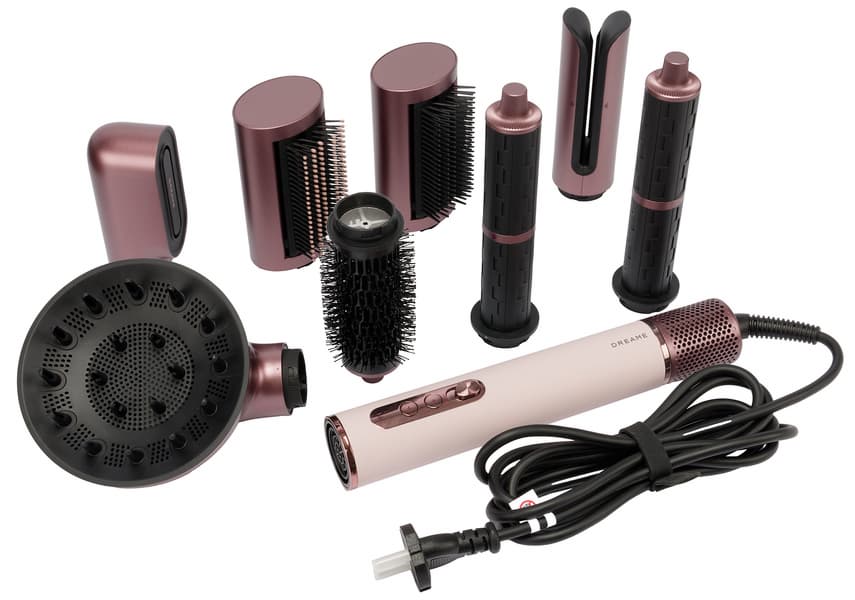 Стайлер Dreame AirStyle Pro AMS01A выглядит стильно и современно. Легкий по весу и совсем небольшой по габаритам основной корпус фена покрыт текстурированной кожей приглушенного бледно-розового цвета. Пастельный оттенок выгодно подчеркивают глянцевые и матовые вставки из пластика благородных оттенков розового золота и пыльно-сливового. Последний использован во всех насадках, кейс и сумка также выполнены в этом цвете. Благодаря гармоничной расцветке весь комплект смотрится крайне привлекательно.