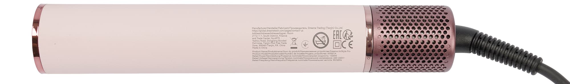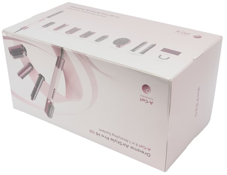Стайлер Dreame AirStyle Pro AMS01A поставляется в симпатичной фирменной упаковке с качественной цветной полиграфией. На бело-розовом фоне с перламутровым покрытием размещены фотографии устройства в полной комплектации, логотип бренда, наименование модели, перечислены ее ключевые особенности и технические характеристики.
