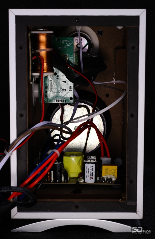 Тыльная сторона активной колонки снабжена RCA-разъемами: двумя для аналогового входа и одним для подключения второй, пассивной колонки. Чуть выше расположен радиатор усилителя мощности. Колонки состоят из ВЧ- и НЧ-излучателей с фазоинвертором, выведенным на тыльную сторону. Такая конструкция предполагает установку стереосистемы задней частью к стене и на небольшом расстоянии от нее, чтобы пользователь мог слышать направленный и отраженный звук. Внутри Microlab H30 BT находятся три платы: блок питания на днище колонки, усилитель мощности на внутренней стороне задней стенки и плата элементов управления, крепящаяся к боковой стенке.