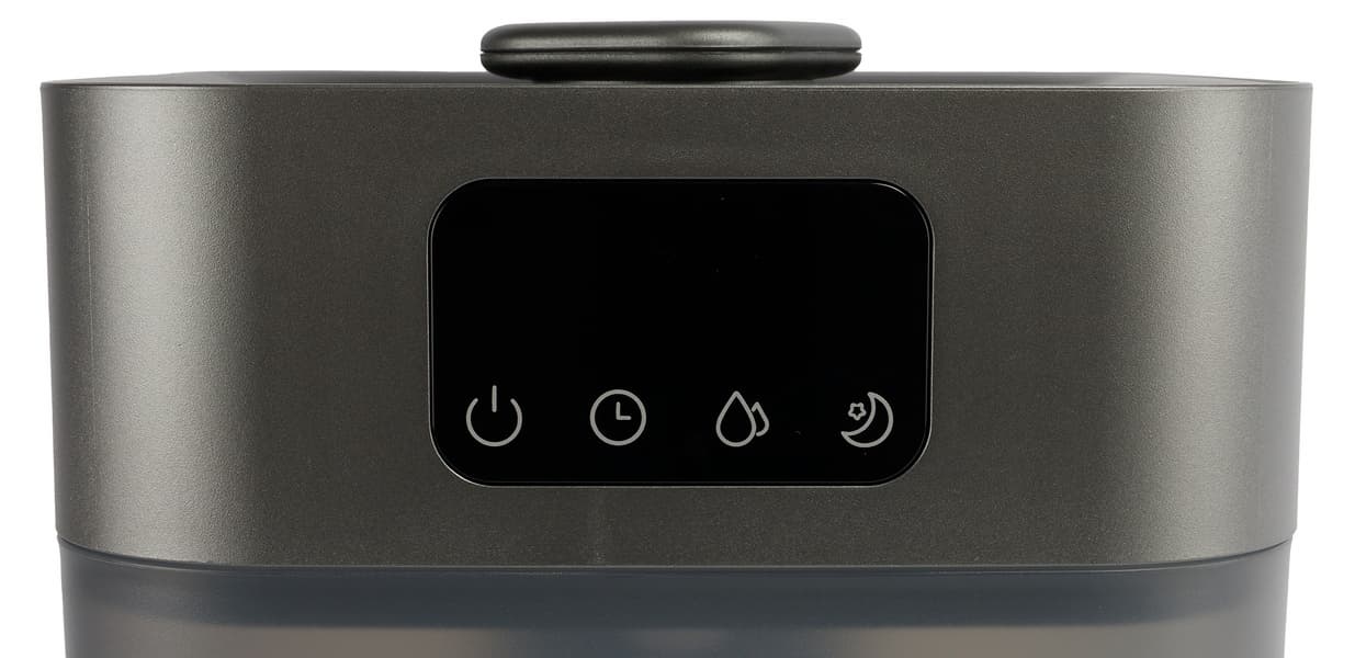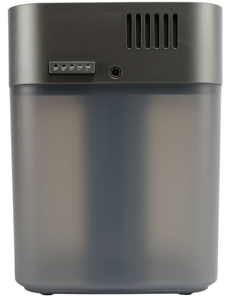 Бак для воды у нашего увлажнителя находится снизу. Его заявленный объем — 5,5 литров. Он сделан из затемненного серого пластика и имеет прозрачную шкалы сбоку с едва заметной отметкой максимально допустимого объема воды.