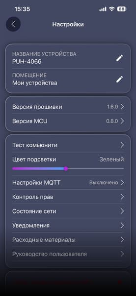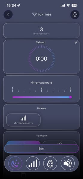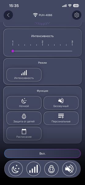Прибор стабильно запускается и корректно реагирует на изменения режимов как с сенсорной панели, так и из приложения. Все основные сценарии — включить, сменить интенсивность, поставить таймер, выключить на ночь — выполняются без задержек и «задумчивости».