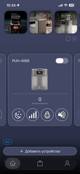 Процесс добавления увлажнителя стандартен — через главное окно «Умного дома» выбираем пункт «Добавить устройство», после чего выбираем из списка различных производителей Polaris IQ Home. Далее вводим данные от нашего аккаунта Polaris и получаем доступ к управлению увлажнителем.