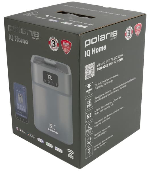 Прибор поступил к нам в классической, хорошо узнаваемой упаковке Polaris — черный картон, крупный логотип компании на каждой стороне. На боковых гранях перечислены ключевые особенности устройства, спереди — фотография самого прибора, а также изображение смартфона с мобильным приложением.
