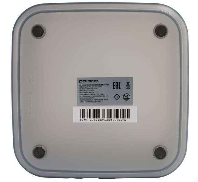 На дне прибора размещены четыре круглые ножки с черными прорезиненными накладками, обеспечивающими хорошее сцепление с любой гладкой поверхностью, а также здесь расположен штрихкод с серийным номером и шильдик с краткими техническими характеристиками.