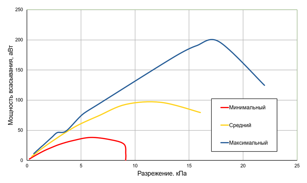 Мощность всасывания (что это такое и как ее измеряем, описано в отдельной статье) мы определяли при работе пылесоса без трубы и насадок, в обоих режимах. Зависимость мощности всасывания от создаваемого разрежения приведена на графике ниже: