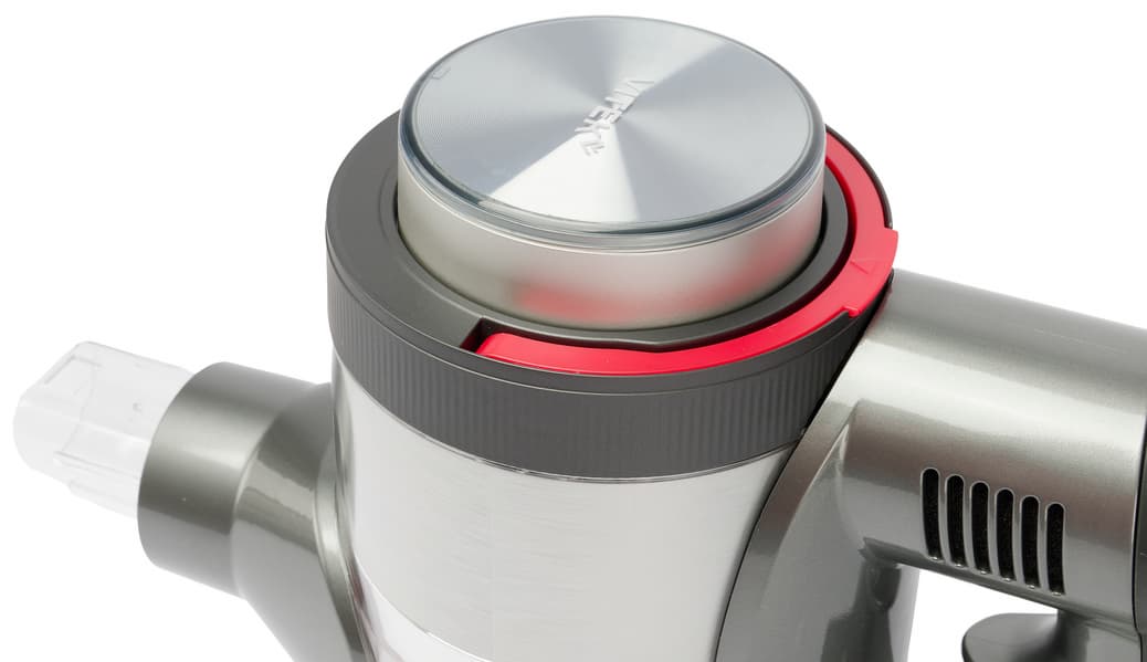 Прозрачные стенки пылесборника позволяют хорошо видеть его содержимое. Мусор скапливается в нижней части контейнера, не блокируя стальную сетку. При необходимости сетку можно очистить, не вскрывая емкость: для этого служит подвижный слайдер, управляемый полукруглой ручкой на верхней стороне.