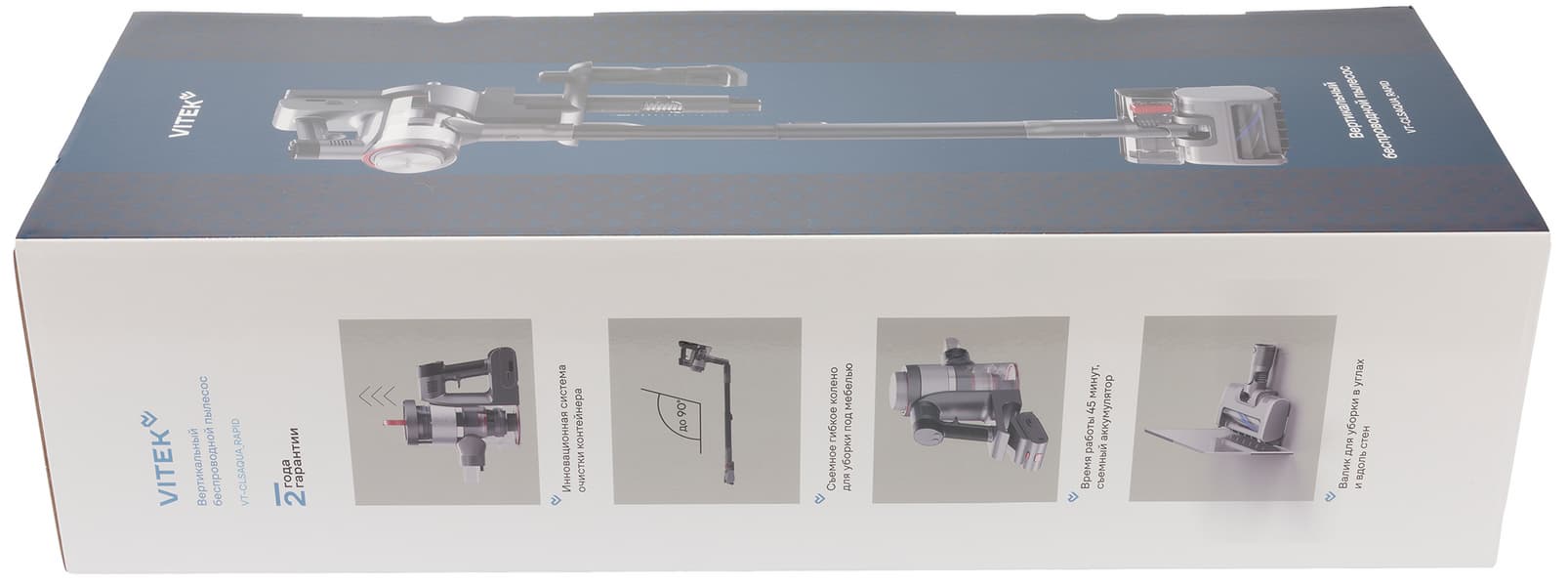 Изображения на боковых сторонах иллюстрируют основные особенности модели: к ним производитель относит инновационную систему очистки контейнера, съемное гибкое колено для уборки под мебелью, время работы до 45 минут, и наличие валика для уборки в углах и вдоль стен.